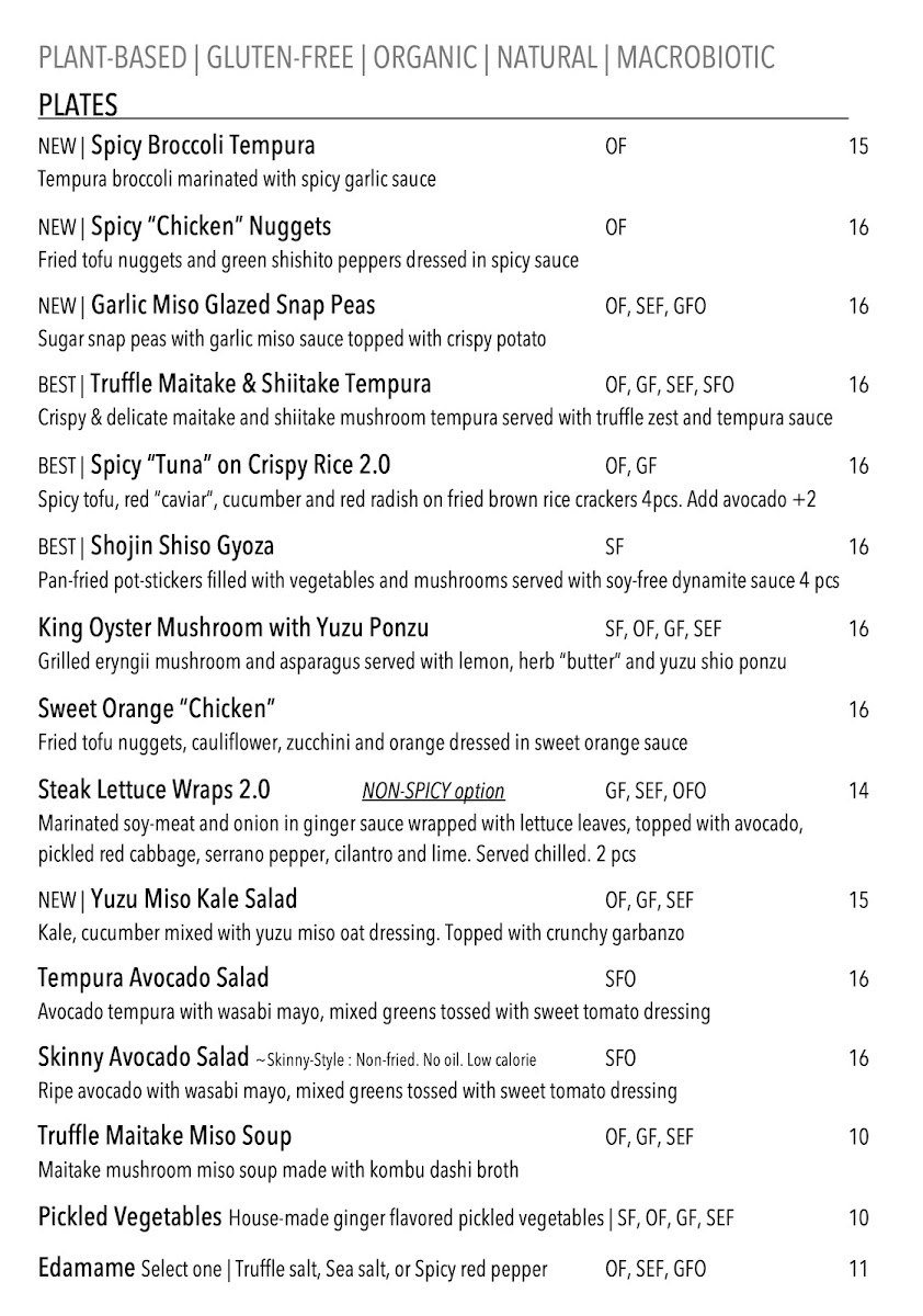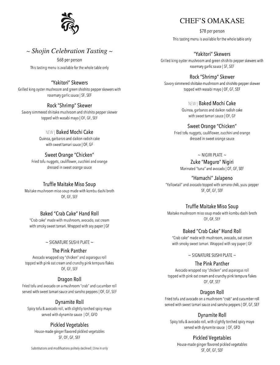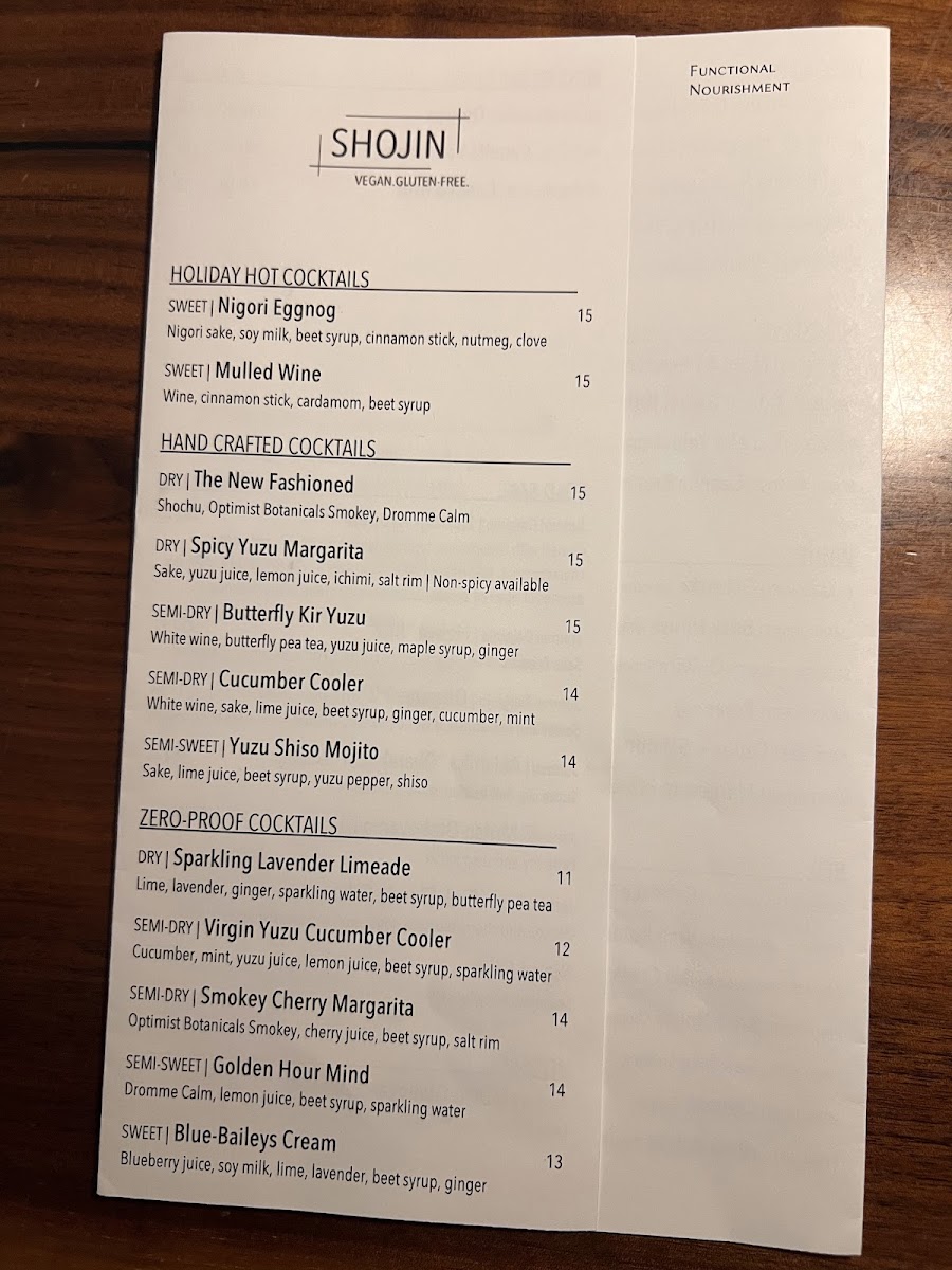 The menu at Shojin offers a thoughtful selection of vegan and gluten-free dishes inspired by Japanese and macrobiotic traditions, presented with a simple, refined approach. Guests can expect a range of plates that feel both nourishing and satisfying—perfect for a relaxed lunch, an intimate dinner, or a quiet moment of mindful dining.