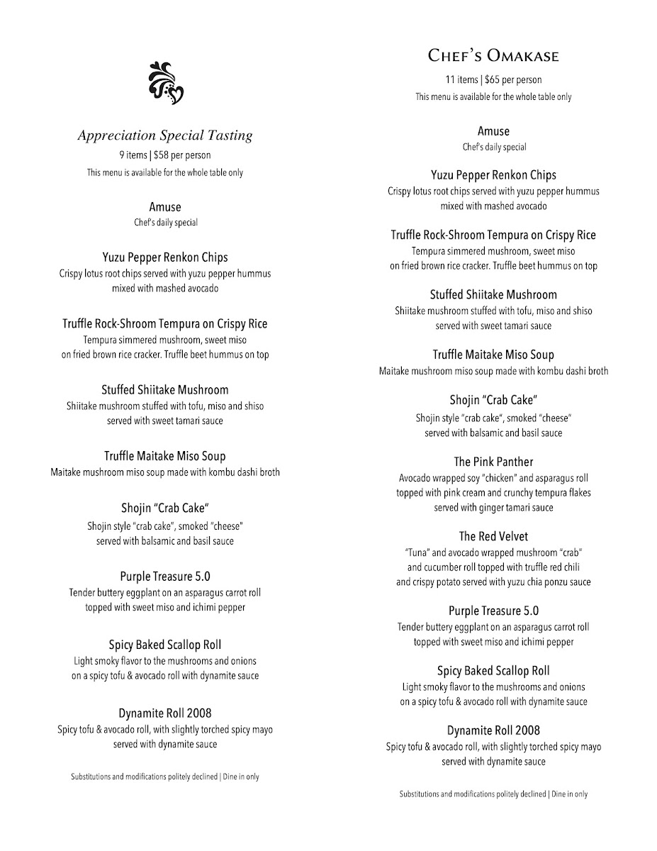 The menu is also complemented by carefully crafted non-alcoholic cocktails, including refreshing choices like Sparkling Lavender Limeade and Virgin Yuzu Cucumber Cooler, which enhance the overall dining experience without overpowering. For those who appreciate a thoughtful drink pairing, selections of sake and natural wines are available to accompany sushi offerings like the Purple Treasure Dynamite Roll or the Spicy Tuna on Crispy Rice.